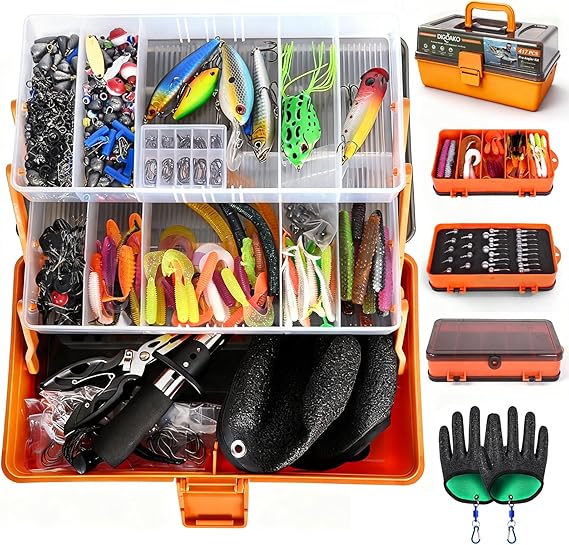 Large Fishing Tackle Box Kit with 3-Layer Organizer & Small Box, 417-Pcs Includes Gloves, Fishing Lures, Hooks, Weights, Bass Fishing Gear for Freshwater, Fishing Equipment Gift for Men​